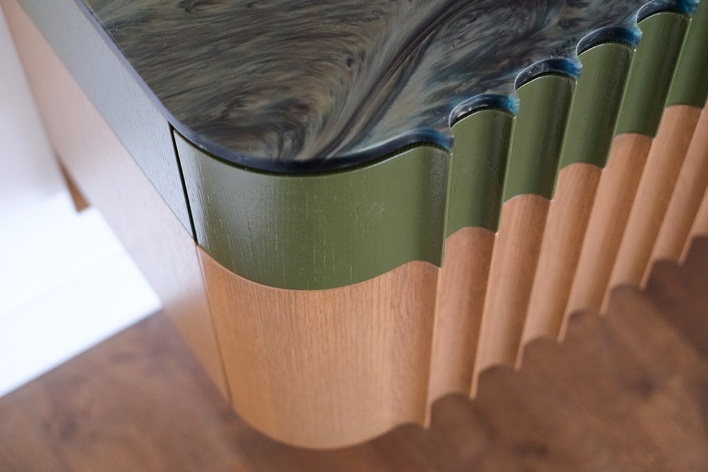This unit has a tilt back wall in sections, the top is a poured resin top with a scalloped front detail to match the scalloping on the drawer section, also the designer wanted a 2 pack paint finish in different sections.