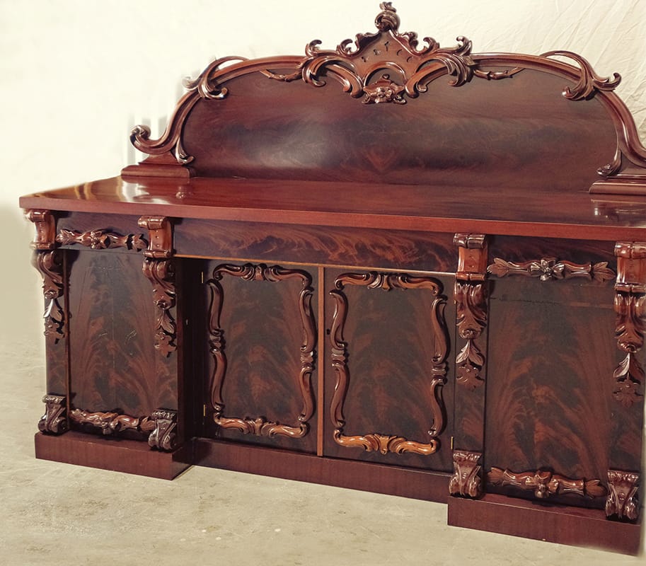 An English C 1810 Flame Mahogany buffet which we had to replace a lot of missing solid timber and Veneer to bring this Buffet back to life. The top was very badly water damaged and other restores said that it couldn’t be fixed. Our high skilled team decided it could be done, they removed the old veneer and dried it out, and made a press to evenly re-glue the top onto the base.